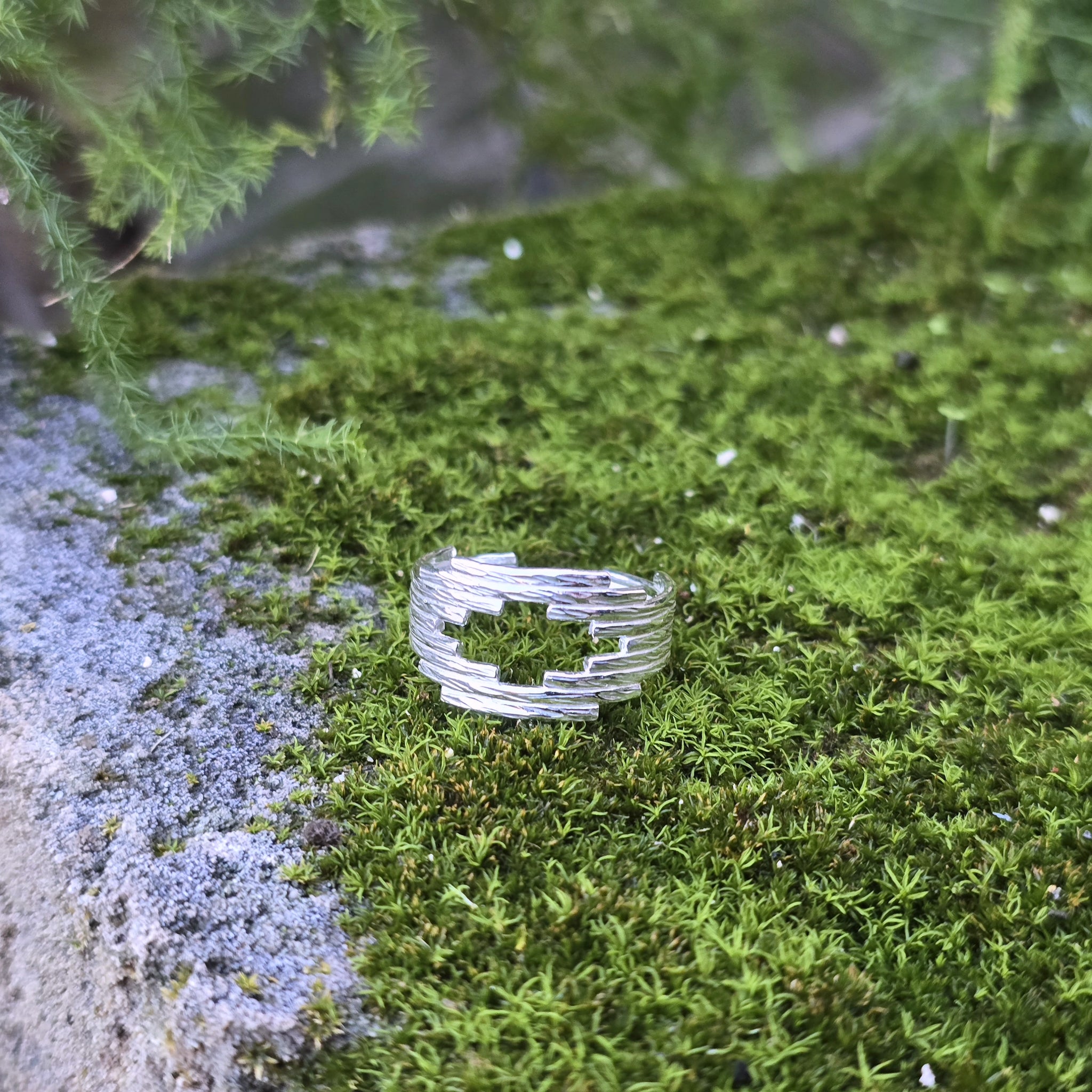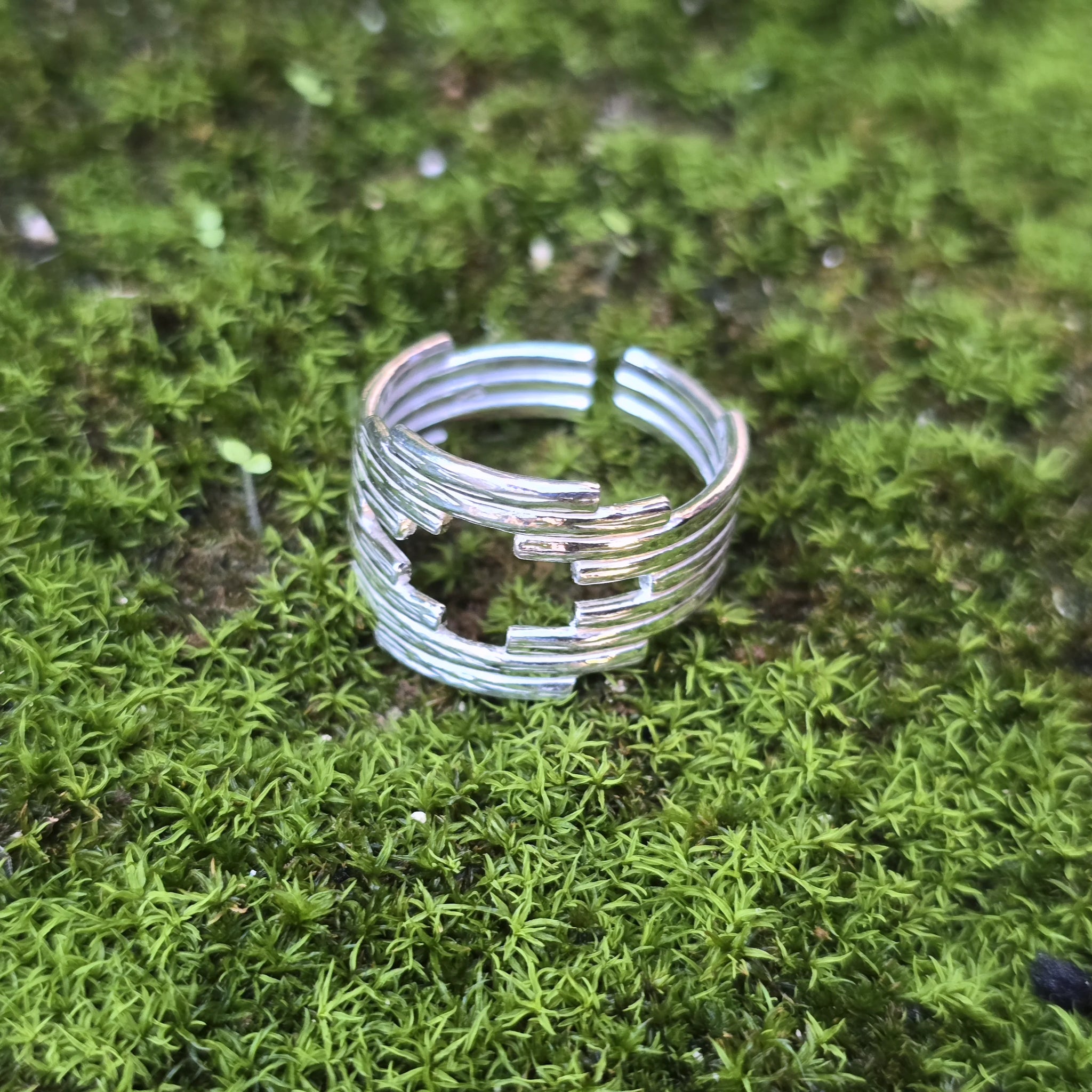 Anillo fino ajustable de plata de ley con textura, imita el estampado de la tela de llengües mallorquina.