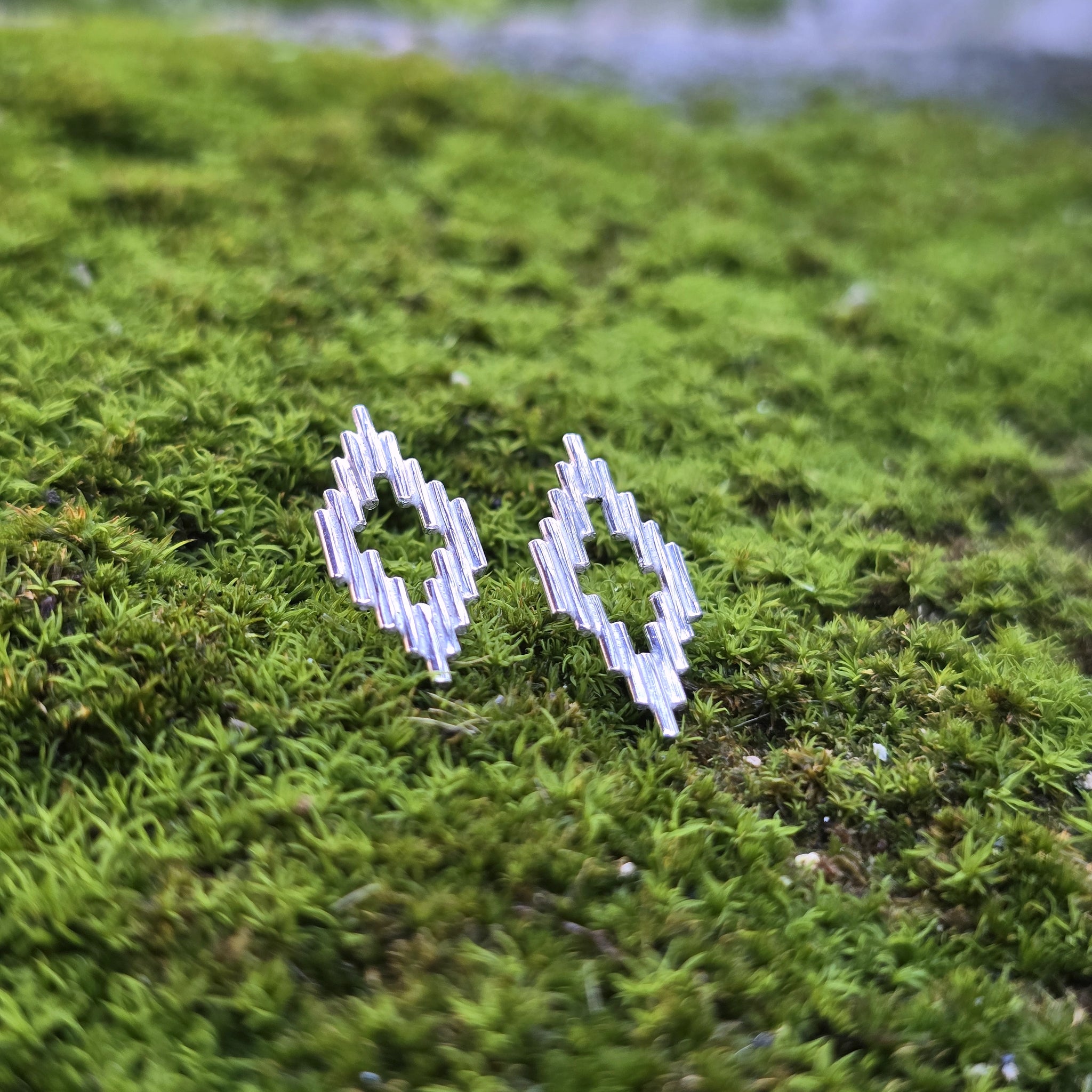 Pendientes cortos medianos de plata de ley con textura, imitan el estampado de la tela de llengües mallorquina. Con cierre trasero de presión.