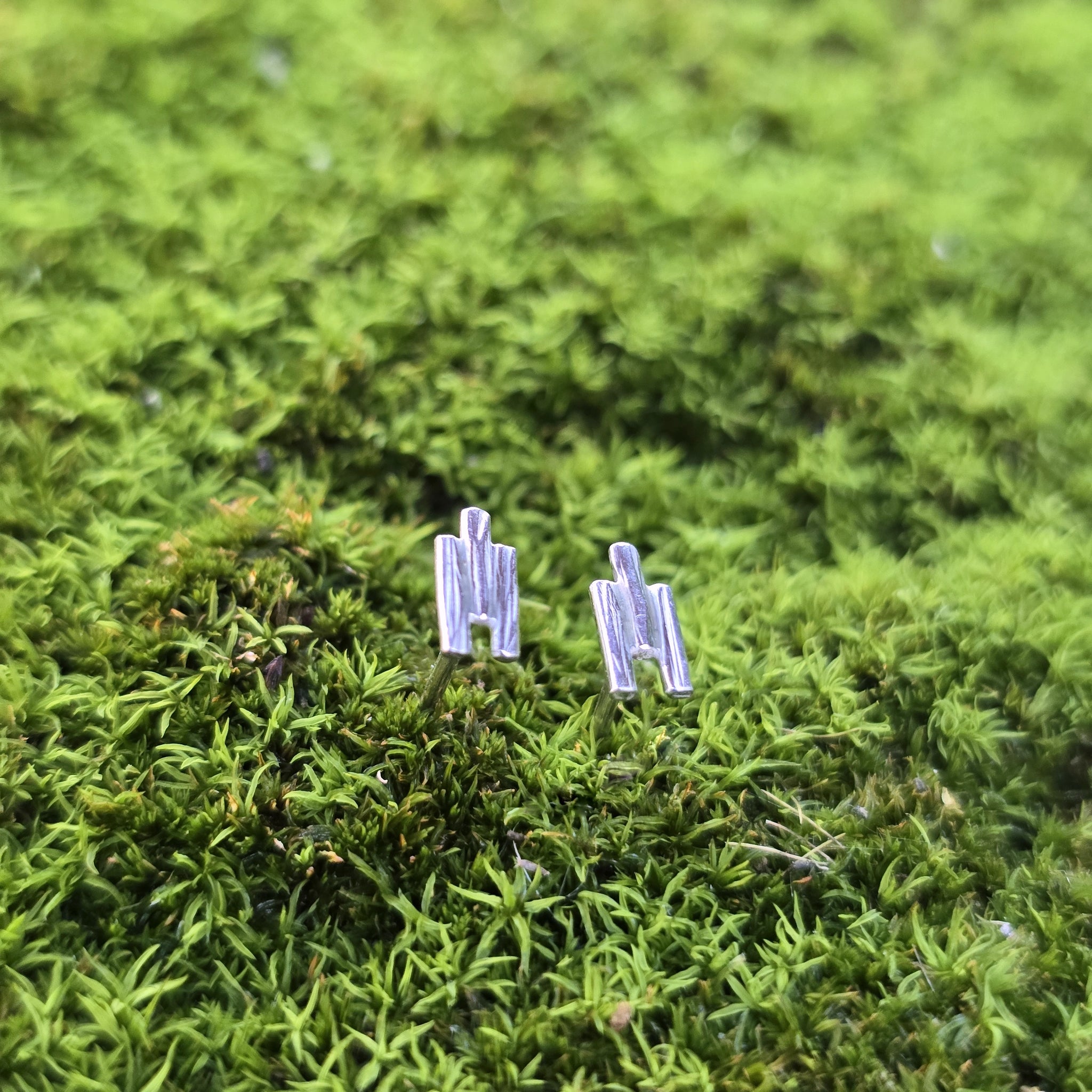 Pendientes cortos pequeños de plata de ley con textura, imitan el estampado de la tela de llengües mallorquina. Con cierre trasero de presión.